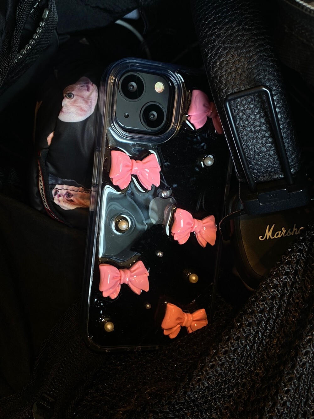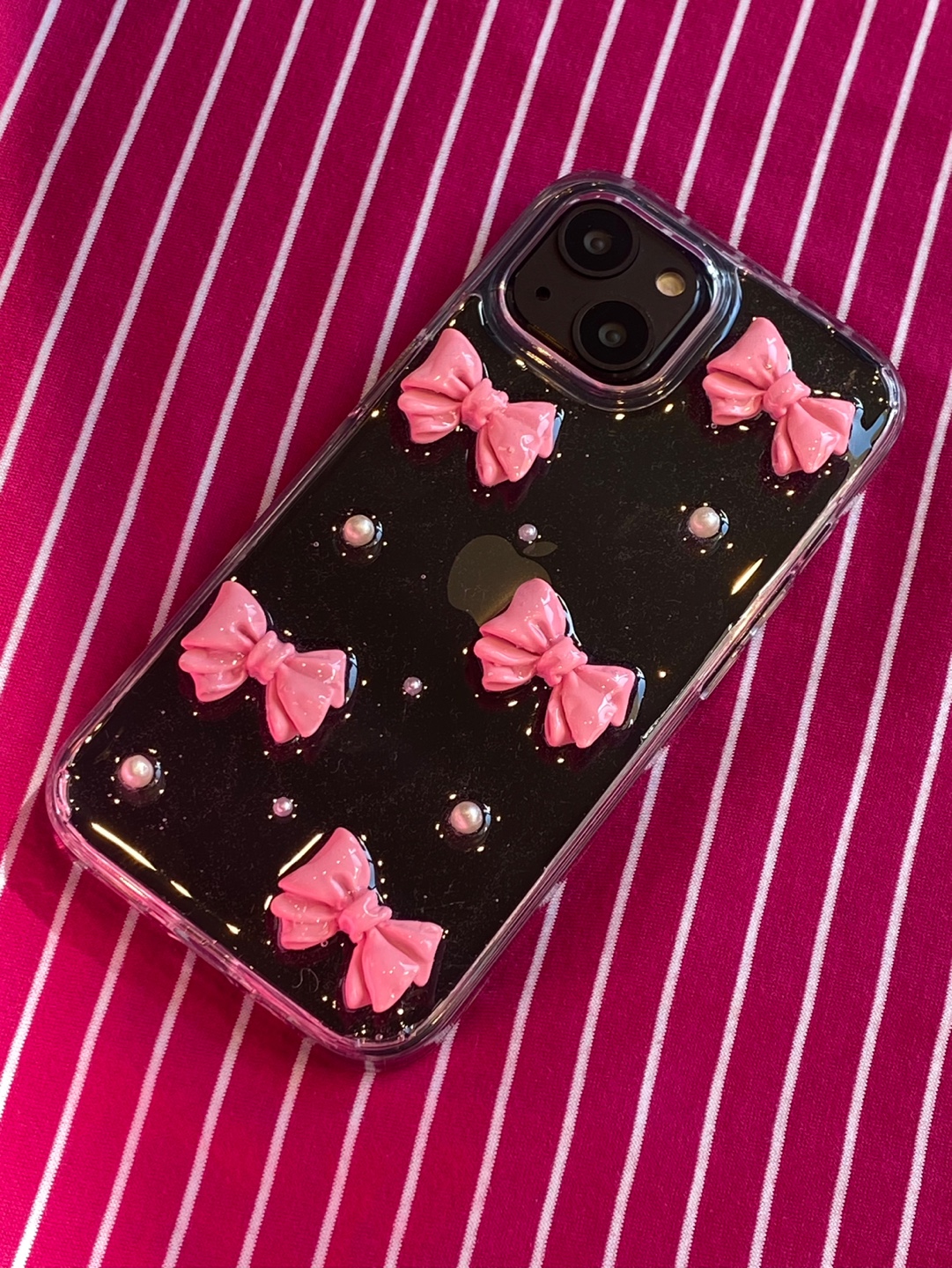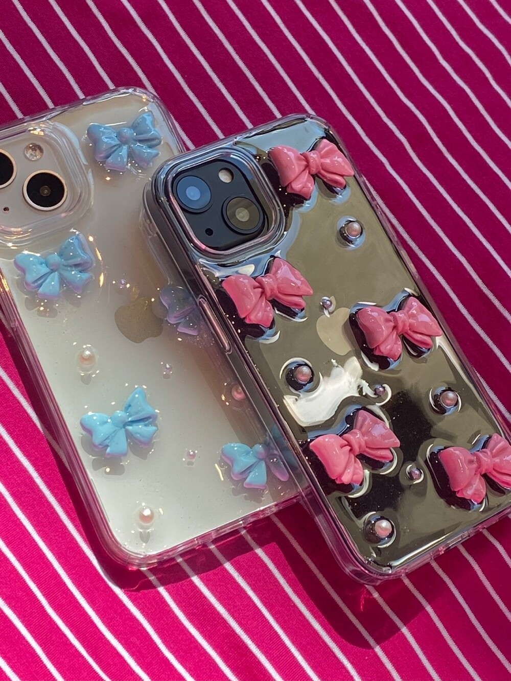 팬시점의 리본 포장지에서 영감을 받아 제작한 폰케이스로, 귀엽고 앙증맞은 리본파츠와 진주를 매치해 사랑스러운 분위기가 드러나는 디자인이 특징입니다.