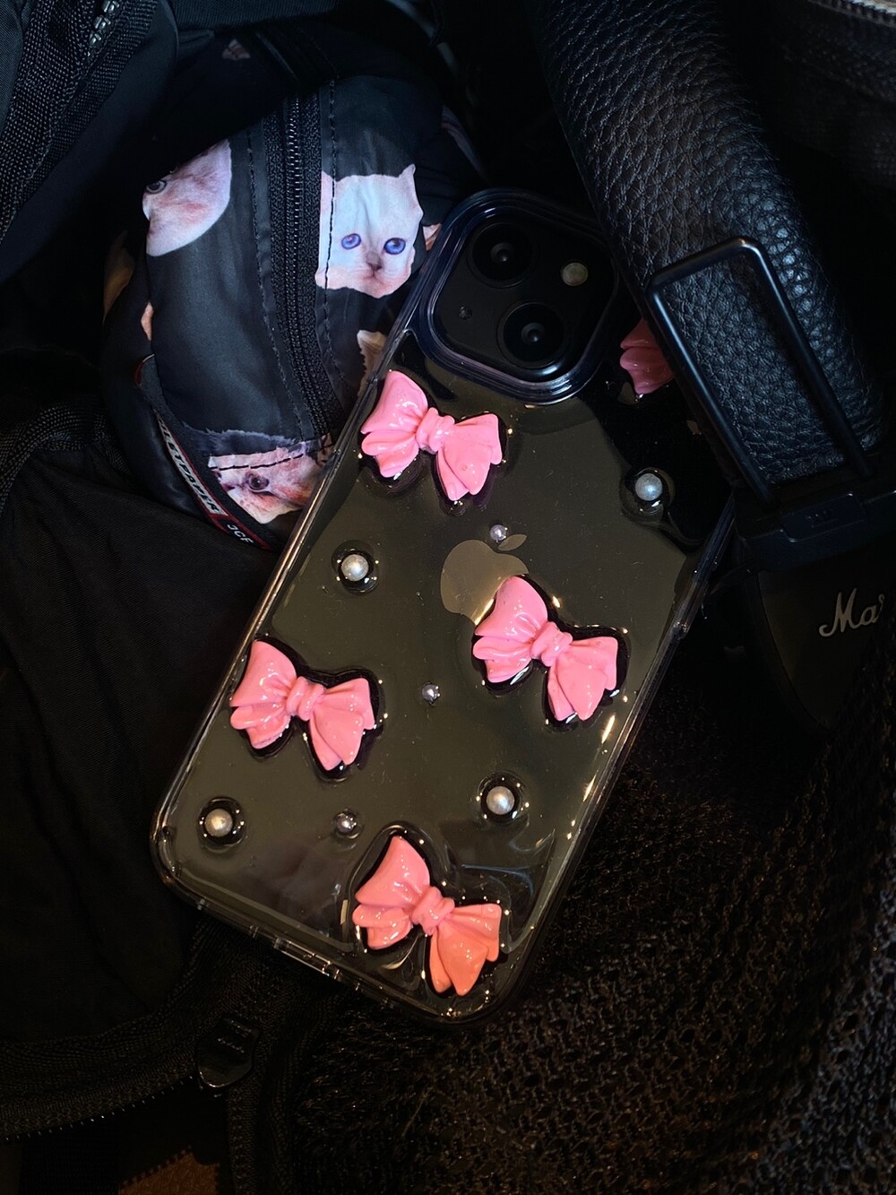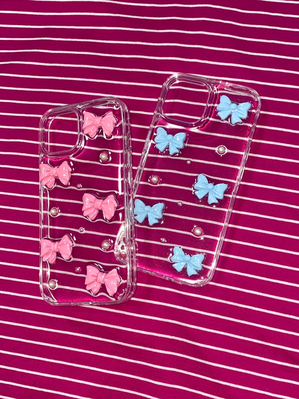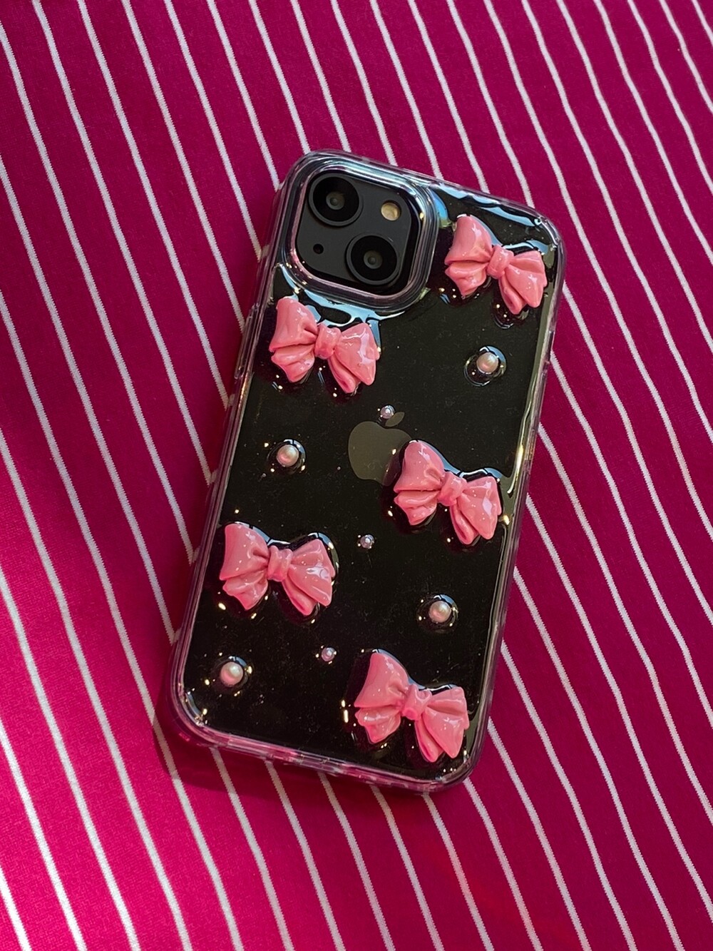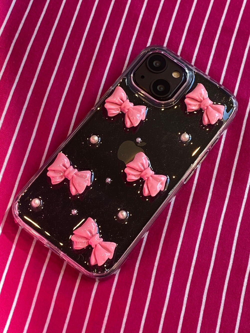 팬시점의 리본 포장지에서 영감을 받아 제작한 폰케이스로, 귀엽고 앙증맞은 리본파츠와 진주를 매치해 사랑스러운 분위기가 드러나는 디자인이 특징입니다.