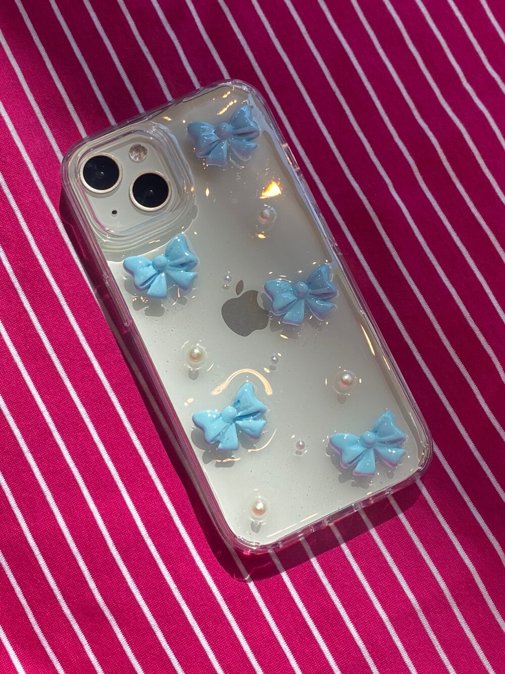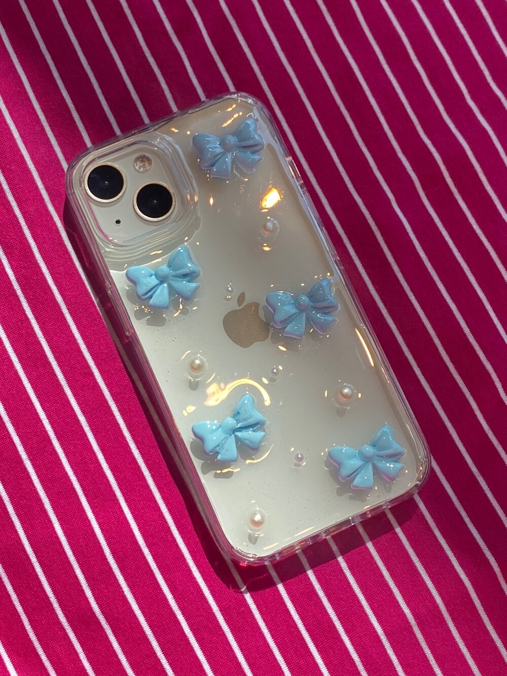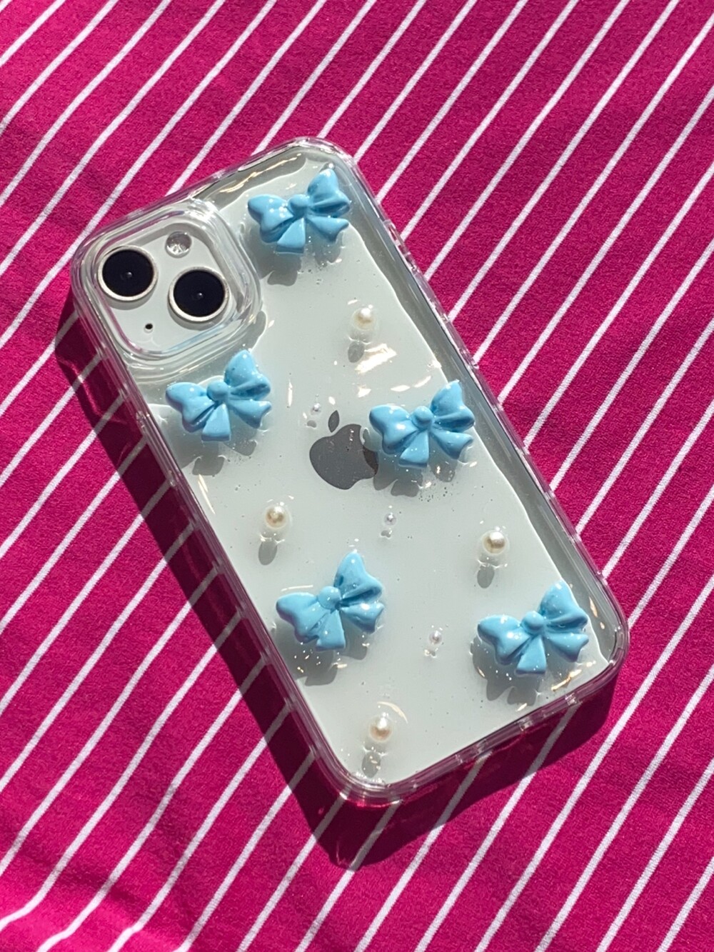 팬시점의 리본 포장지에서 영감을 받아 제작한 폰케이스로, 귀엽고 앙증맞은 리본파츠와 진주를 매치해 사랑스러운 분위기가 드러나는 디자인이 특징입니다.